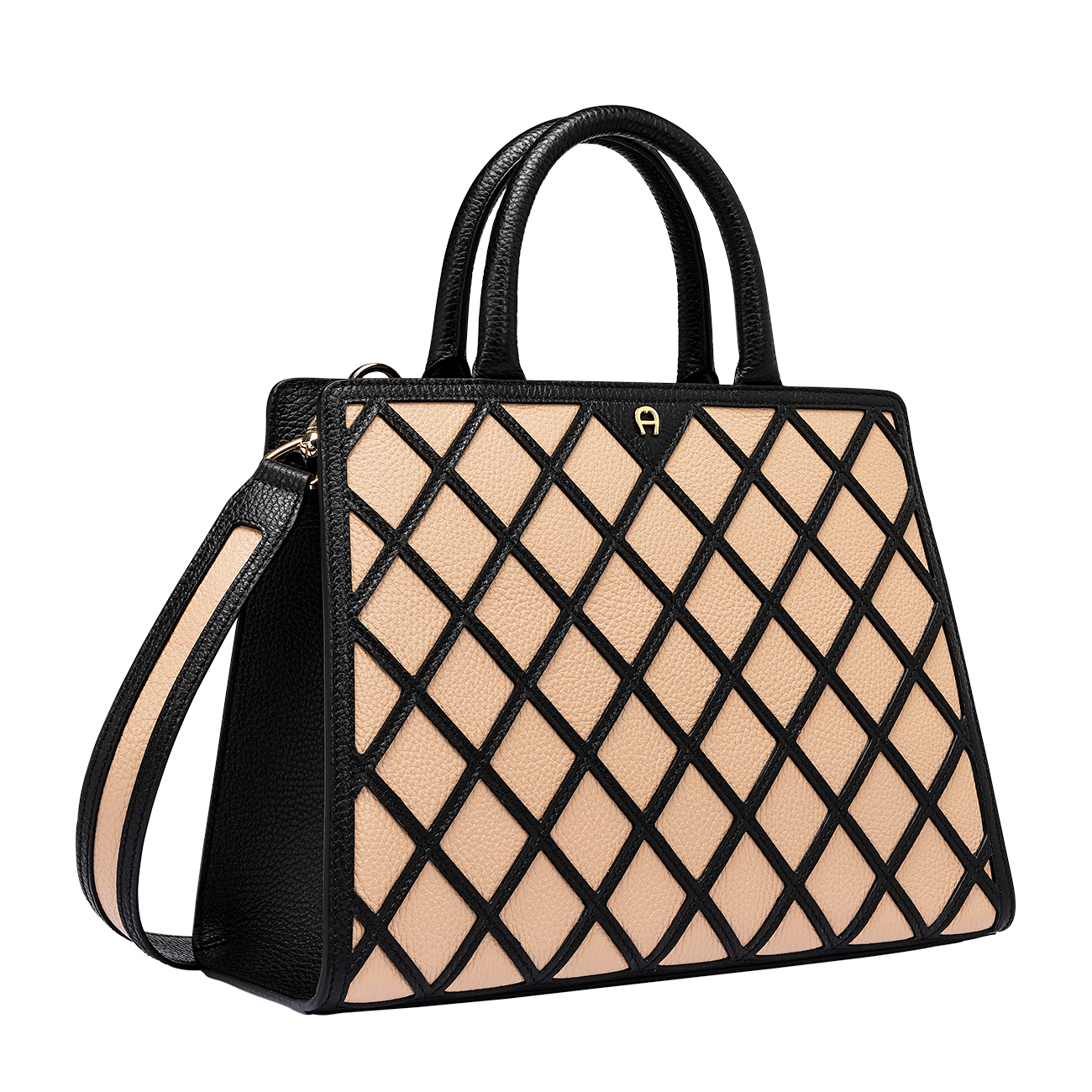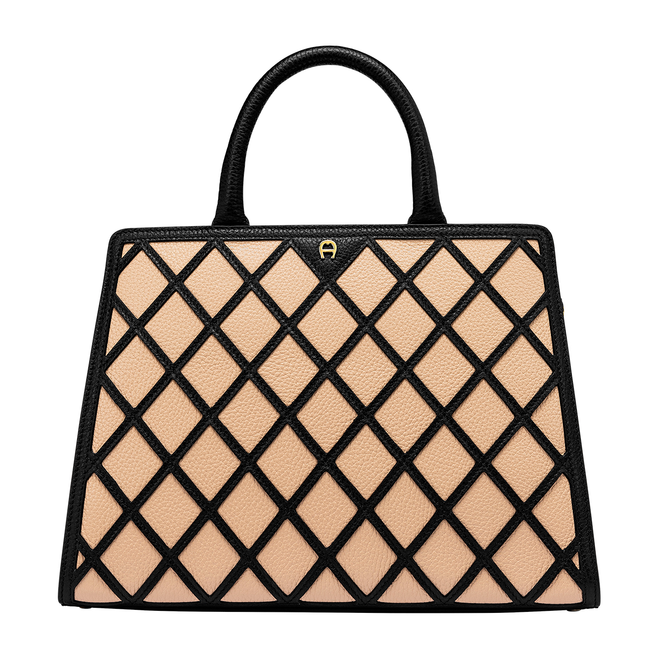 每一季AIGNER 的經典包款都佔有一席之地。季節性色系如「金盞橘」、「牛奶白」及「榛棕色」。CYBILL Special 是色彩及形狀的翻玩。本季運用的菱形格紋創造出以撞色強調出三維效果。「杏仁米色搭配牛奶白」和「黑色搭配駝色」的組合為 CYBILL Special 帶來夏日輕盈而優雅的外觀。 此外,CYBILL 還採用「Dadino」經典花色深棕“Dadino Brown”和淺色“Dadino Beige”的LOGO印花。